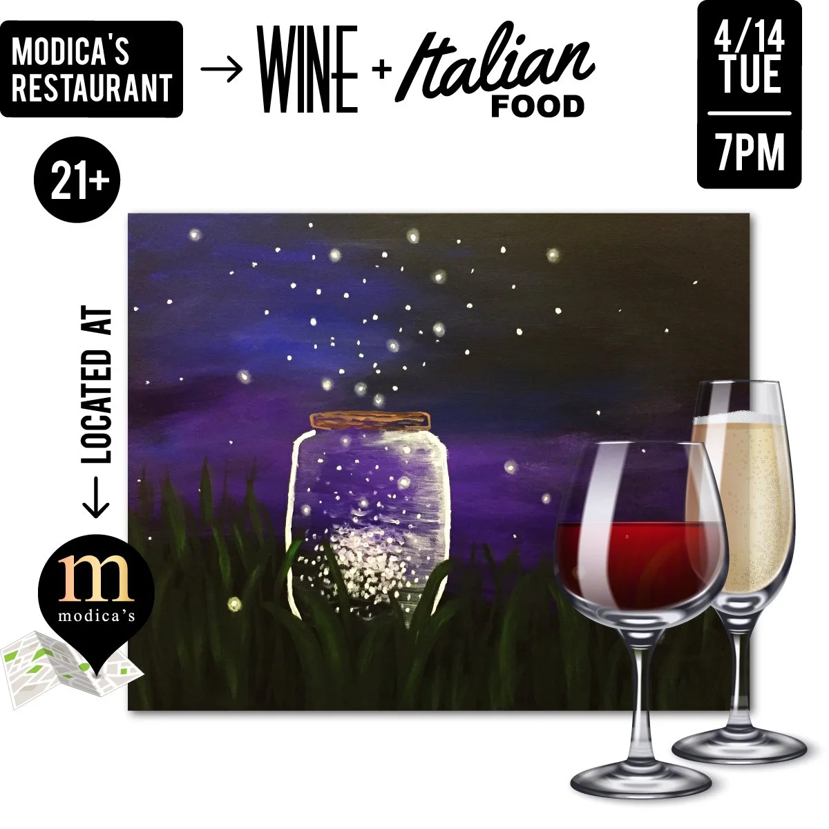 • MUST be 21+ • Each person MUST purchase at least $20 worth of food, alcohol, or non-alcoholic beverages from Modica’s Restaurant during this event • BYOB is NOT ALLOWED at this event