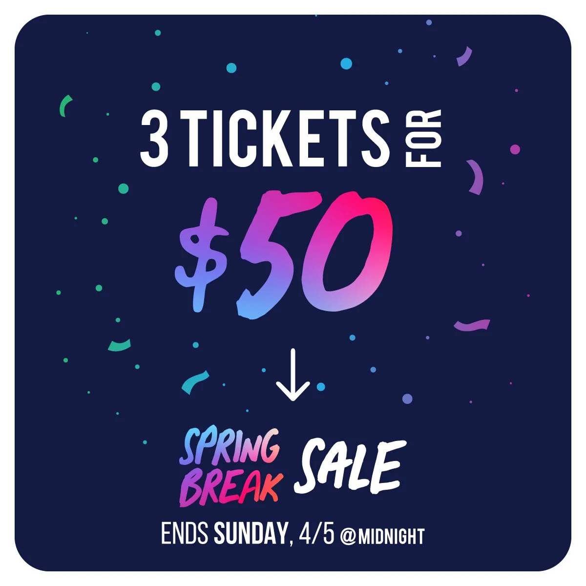 DEAL ENDS SUNDAY, 4/5 AT MIDNIGHT! 3 Tickets for only $50! This is a package with a value of $120 (3 full price tickets). You’re welcome to use this 3 Ticket Package all at once or over time.