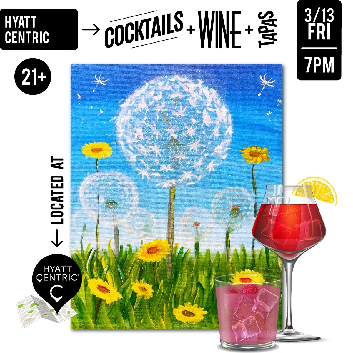 Learn how to paint “Spring Wishes” step by step! This event is located indoors at the Watercraft Bar at Hyatt Centric The Pike Long Beach! Admire the beautiful hotel while savoring delicious tapas, discovering inventive craft cocktails, sipping a refreshing local brew or choosing a glass of wine. All materials included!