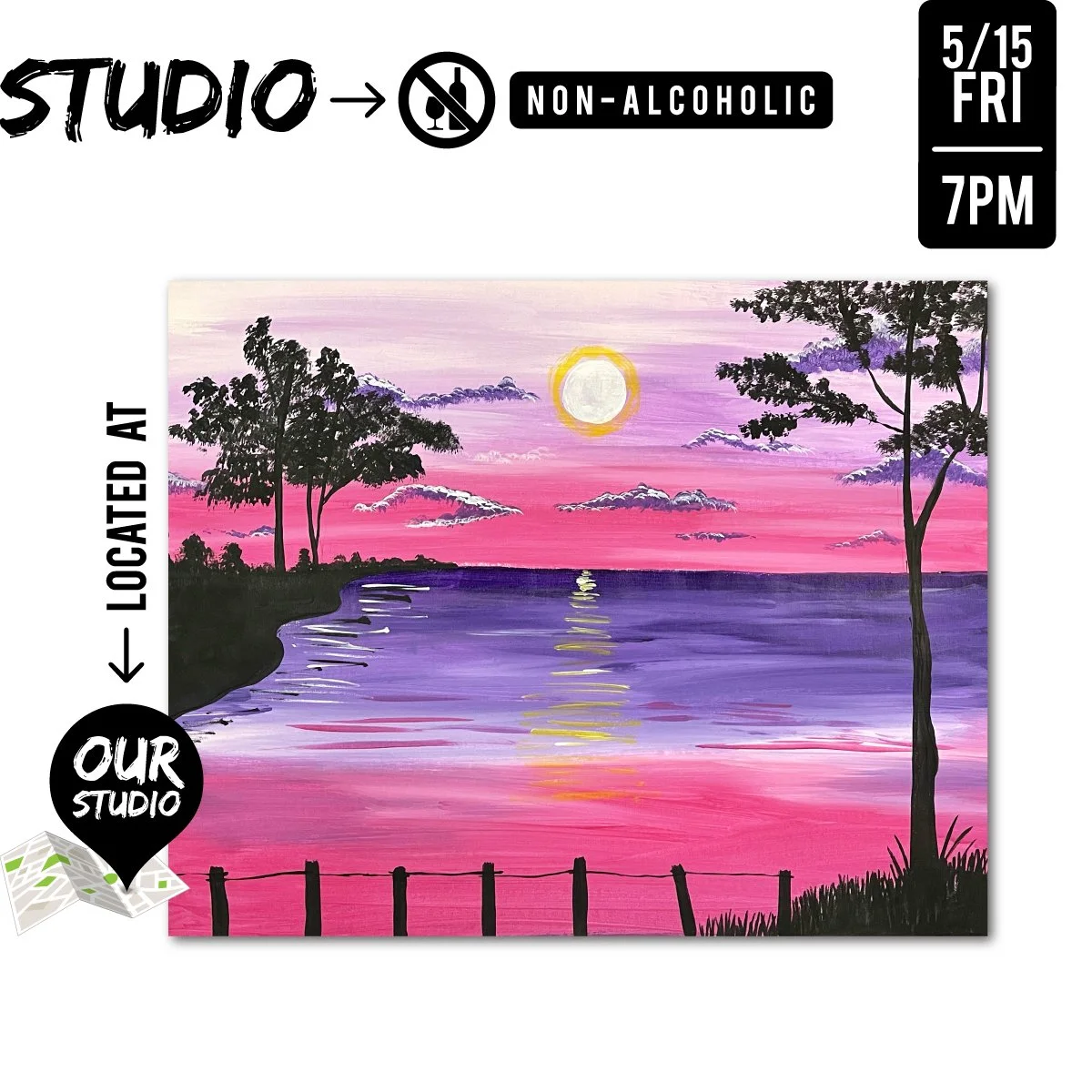 Learn how to paint “Sunset Reflection” step by step! This event is located at Brushstrokes + Beverages™ Studio Location in the heart of the East Village Arts District of Long Beach, CA! All materials included! No alcohol allowed at this event.
